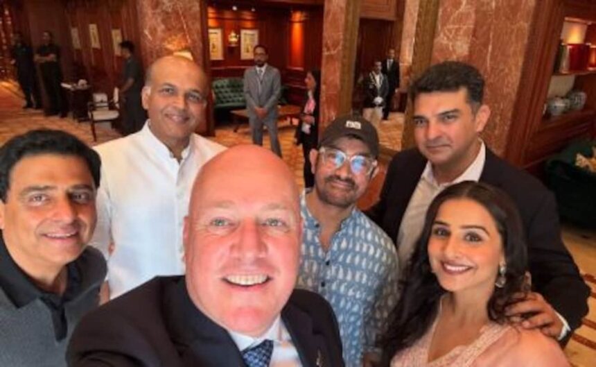In the photo, Aamir Khan, Vidya Balan, Siddharth Roy Kapur, Ronnie Screwvala, and Ashutosh Gowariker can be seen posing while Christopher Luxon takes a group selfie.