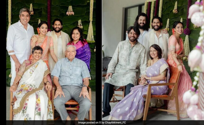 Naga Chaitanya and Made In Heaven star Sobhita Dhulipala got engaged in Hyderabad earlier this week. The couple posted photos from the ceremony on Friday. Now, new photos from the ceremony are going viral and they feature the newly engaged couple posing with their families. The photos shared by several fan pages, feature Naga Chaitanya’s brother Akhil Akkineni, his mom Lakshmi Daggubati, dad Nagarjuna along with his wife Amala Akkineni. The caption on the photo shared on a fan club on X (earlier known as Twitter), read,”Chay’s mother Lakshmi garu at Naga Chaitanya and Sobitha Dhulipala engagement ceremony.”